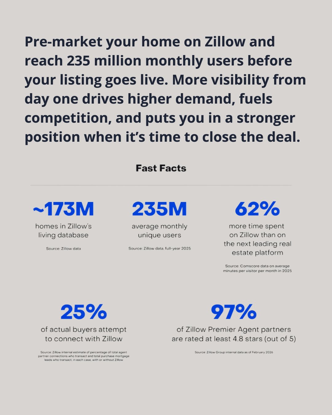 A successful home sale often starts before a property ever hits the market. With Zillow pre-marketing, your home can reach 235 million monthly users before going active. Creating early exposure, stronger demand, and a strategic advantage from day one.